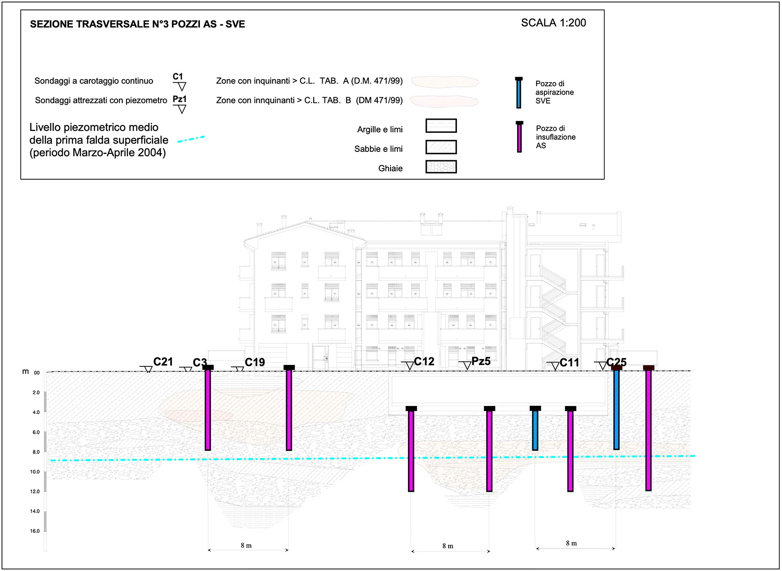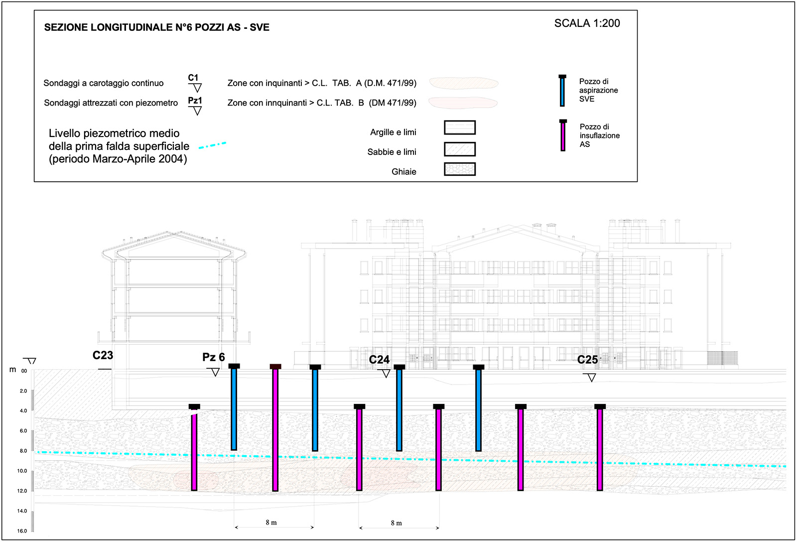 - Tipologia intervento: bonifica in situ tramite l’esecuzione di due impianti in parallelo: immissione di aria in falda e recupero dei vapori rimossi.